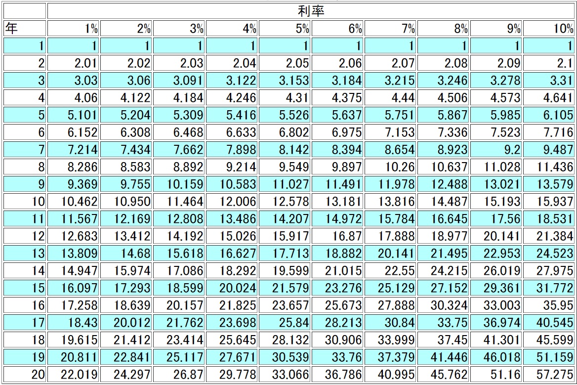 毎年○○万円づつ積み立てて、年○%で複利運用すると○○年後にいくらになるか算出する時に「年金終価係数」を使うと便利です。